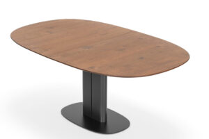 Der Esstisch «Amieta» setzt mit seiner Form den Gedanken an die „gemütliche Runde“, den „Freundeskreis“ oder auch den „Familienkreis“ um.