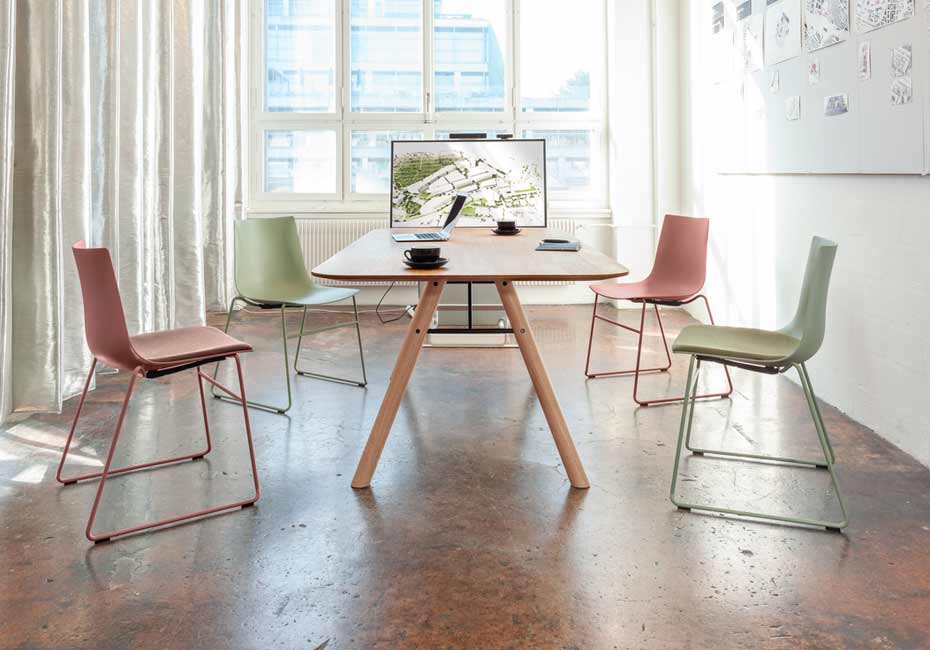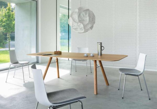 Der Massivholztisch «Akio» verbindet klare Linien mit hochwertiger Verarbeitung und schafft so einen modernen Mittelpunkt für Arbeits- und Lebensräume. Sein reduziertes Design steht für Ruhe, Funktionalität und zeitlose Eleganz.