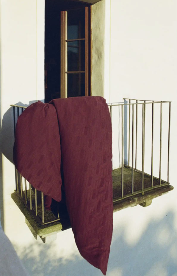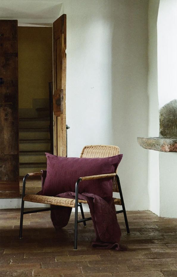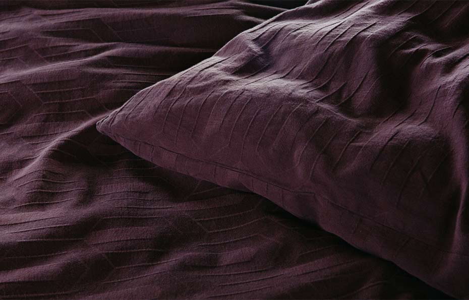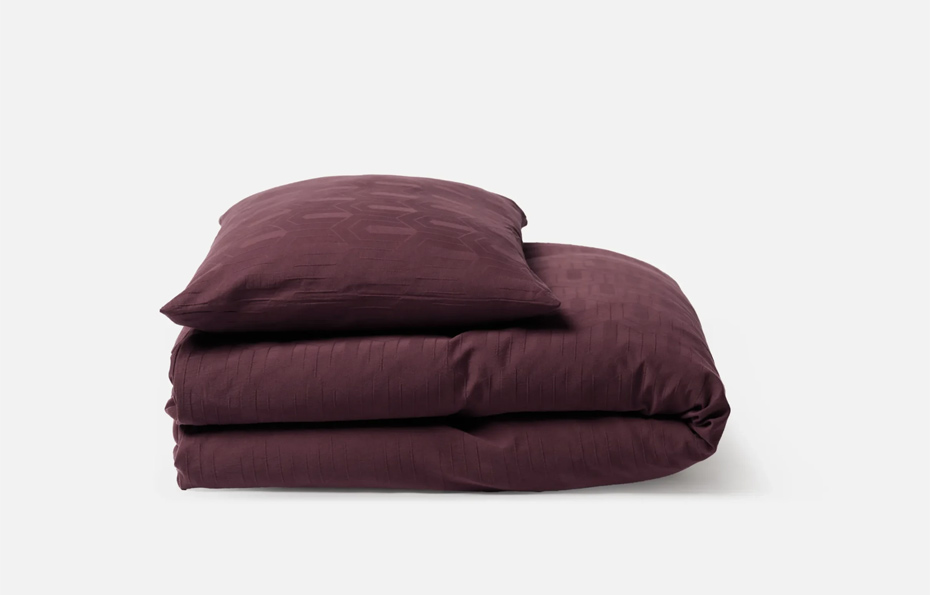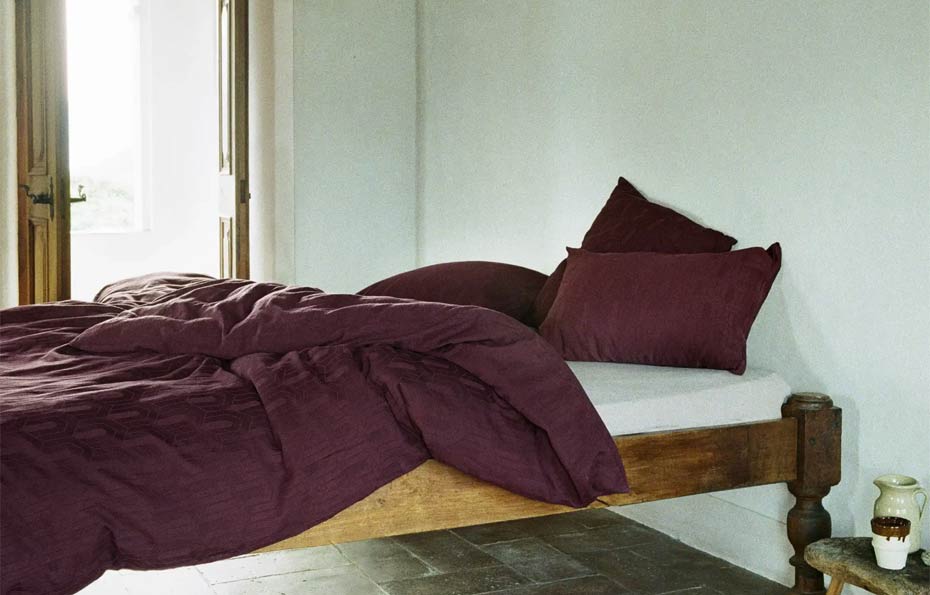 Das geometrische Jacquard-Muster von der Bettwäsche «Vairano» Vino erinnert an die Ton- und Steinplatten der Tessiner Architektur. Je nach Lichteinfall entsteht ein feiner Relief-Effekt. Das tiefe Weinrot setzt einen warmen, natürlichen Akzent.